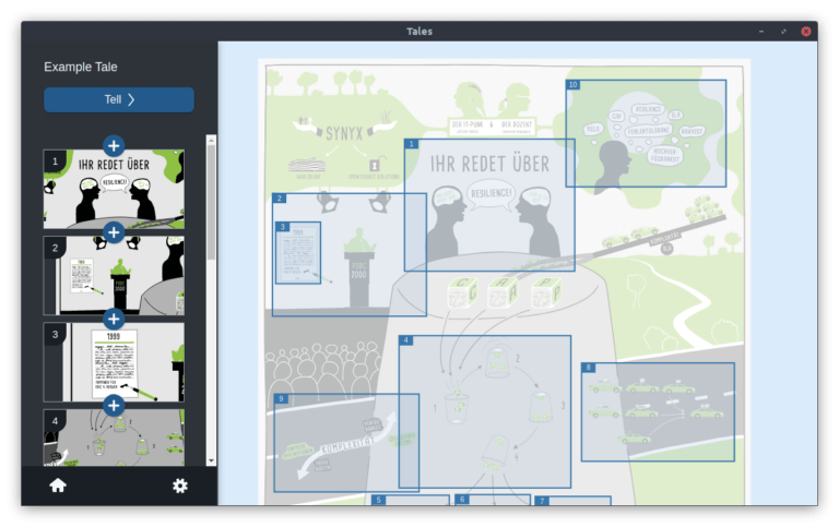 Unter den weiteren Produkten findet sich auch Tales, eine Präsentations-Software Marke Eigenbau. Sie ist ebenfalls Open Source und auf https://github.com/synyx/tales zu finden. Die Grundlage der Präsentation ist eine riesige Karte, welche die komplette Präsentation beinhaltet. Auf dieser definiert der Presenter dann Sprungmarken, welche als „Slide“ mal einen Überblick über einen Teilbereich der Präsentation geben, mal Details zu einem Aspekt hervorheben. Das Ergebnis ist die Geschichte, die man im Rahmen der Präsentation erzählen möchte – eben eine „Tale“.