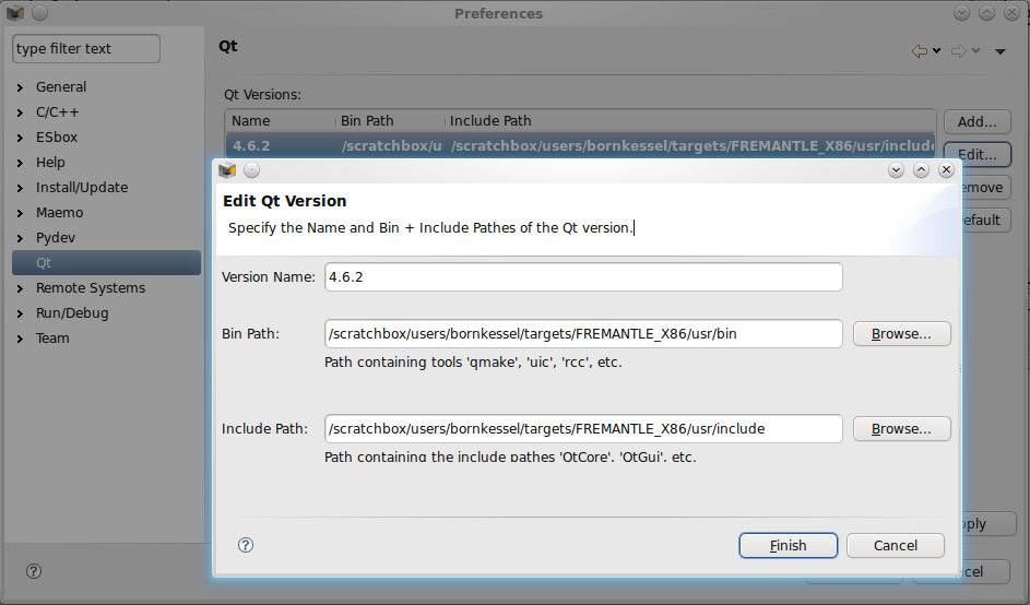 First of all Goto Windows->Preferences_>Qt and add a new entry in the list. The Version needs a label. I chosed the version of Qt. Then you have to add a few paths in the scratchbox environment where Qt and its helper programs are located. Have a look at the image below.